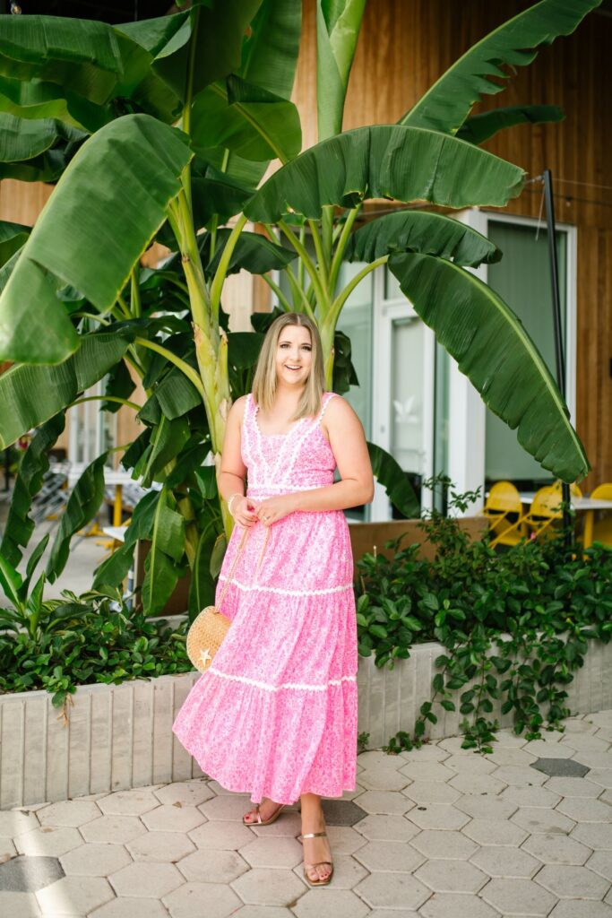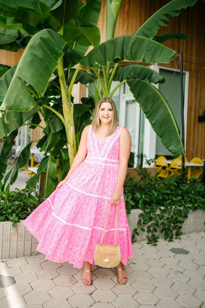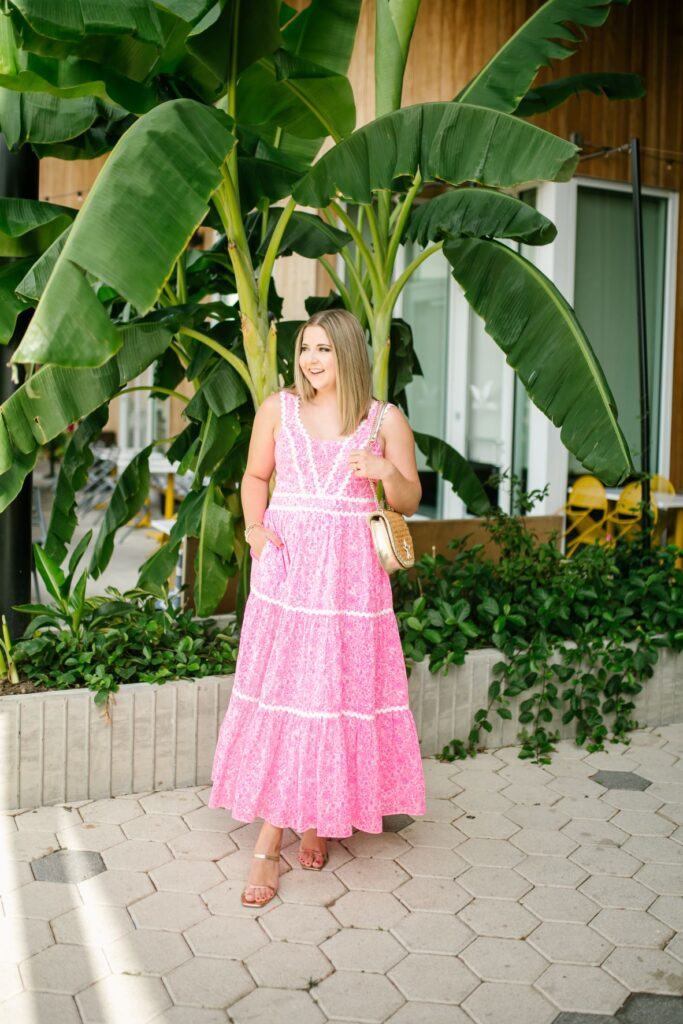 If you tend to look for things more muted or try to blend in this may not be the dress for you the neon pink print really pops and looks gorgeous with a tan. This dress would be the perfect beach vacation dinner dress. It’s also extremely breathable because it’s 100% cotton making it perfect for a vacation dress or any hot weather climate.