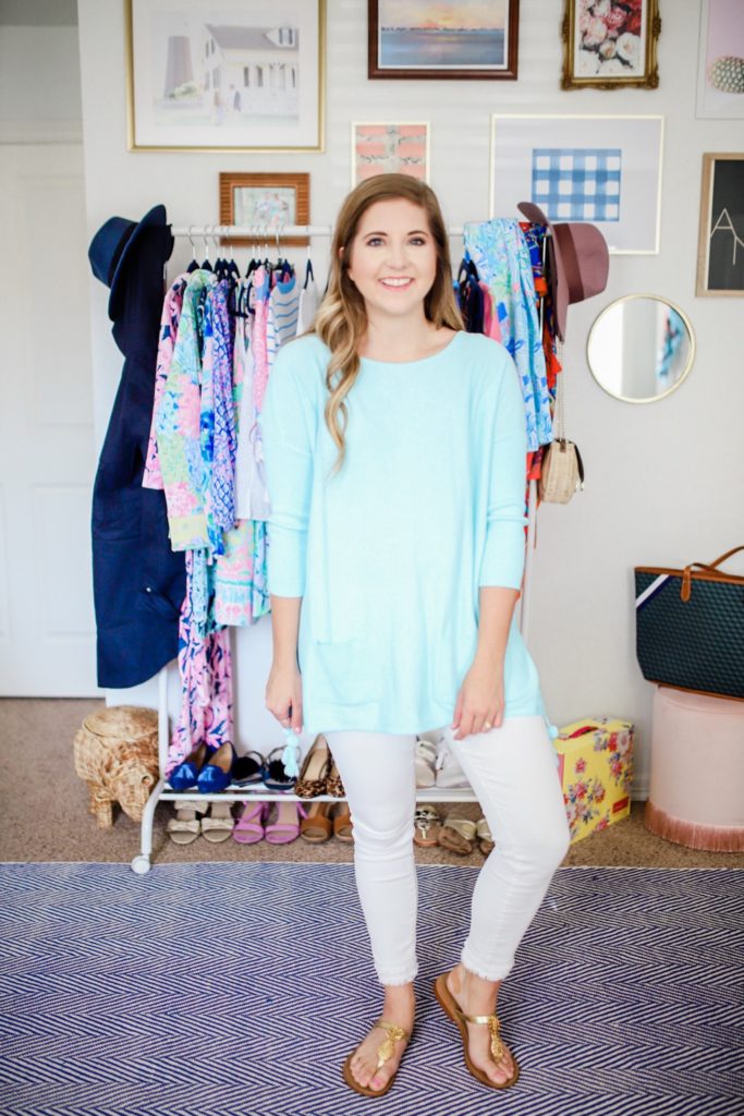 This is my first time owning a Skipper Popover from Lilly, but I really like it. It’s a good weight where you cans till layer underneath it but also wear it on its own. I am wearing a size small and realistically I could have done an XS since it is a little long and big in the sleeves but I figured it would shrink a tad in the wash so I sized up just to be safe.