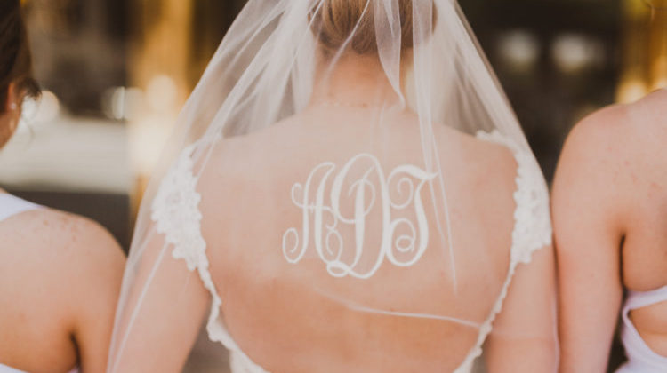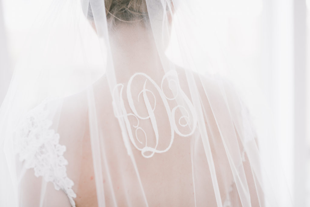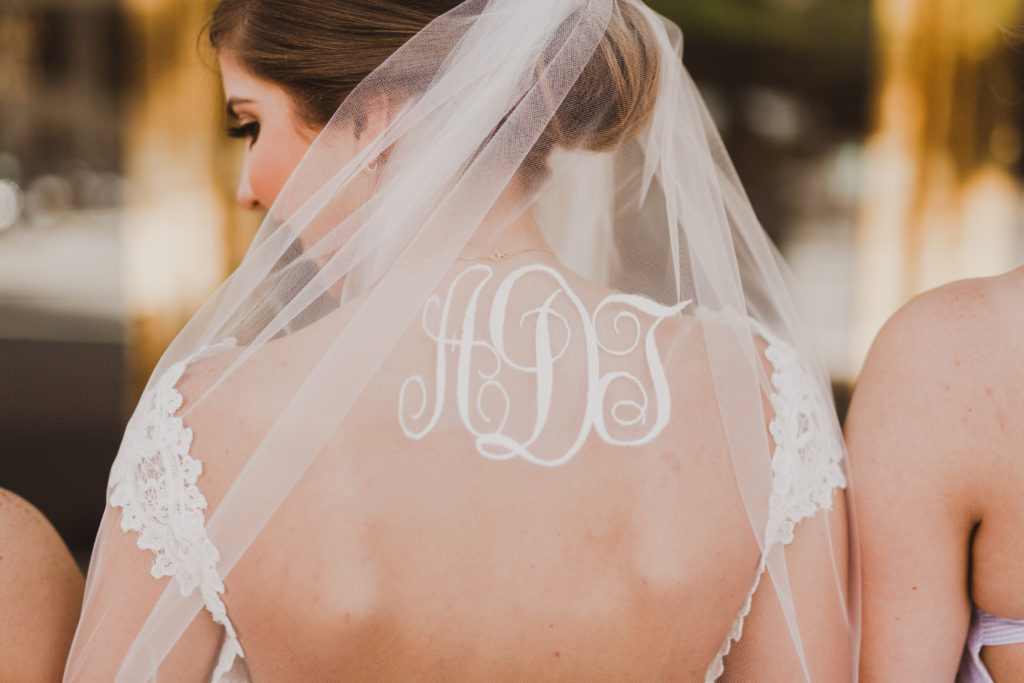 I chose my dress with a low back purposefully, so I could have a monogram on my veil to hit at my shoulder blades. Easy enough right? Wrong! I bought my veil and thought I could just get someone to easily sew my monogram on it. After calling what seemed like every single person in the Dallas/Fort Worth area no one was brave enough to do it because the material of the veil was so thin. Everyone was afraid of ruining the veil because of the machine getting caught or hung on the thin fabric.