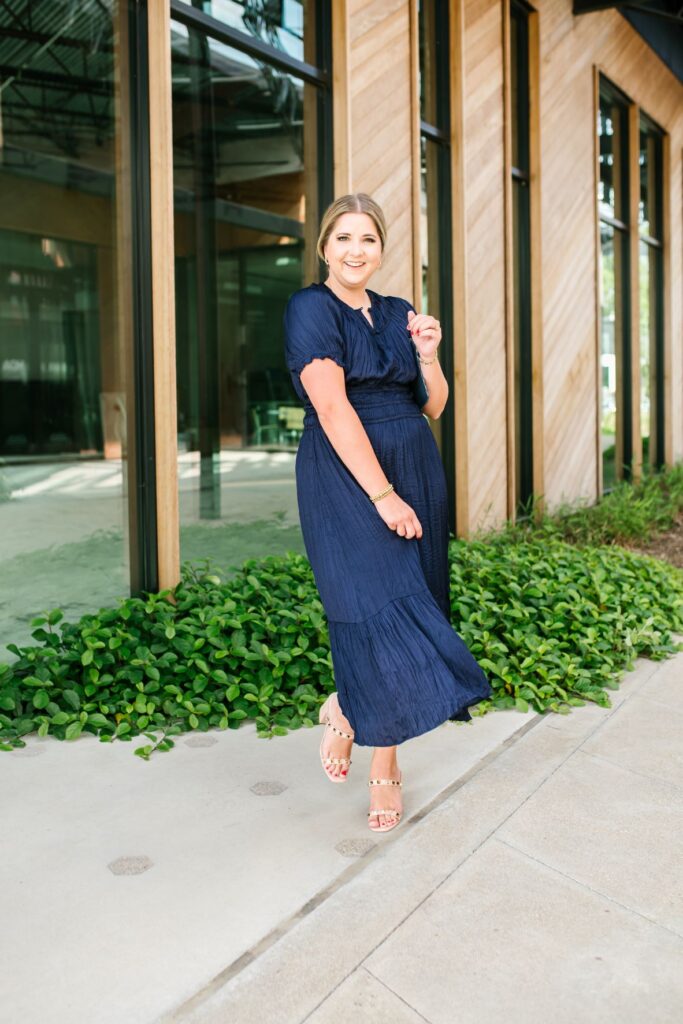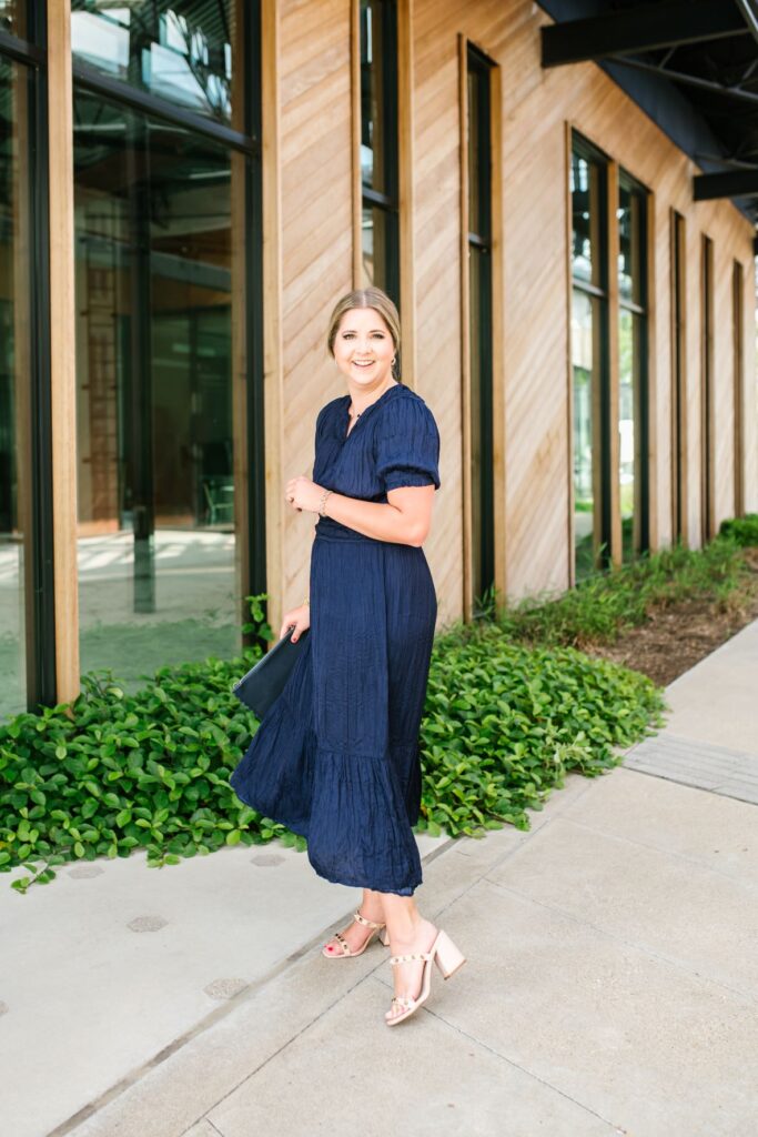 It is HOT here in Texas, it feels like 106 degrees outside hot and I’m not exaggerating. I’ve been living in as little clothing as possible, and that’s dresses! They are easy to throw on while looking polished and still staying cool. A lot of places are releasing their new fall items and the LAST thing I want to buy right now is sweaters but I am looking for pieces that can be worn now in the heat and transition into fall. This navy midi dress is going to be one of those easily transitional items.