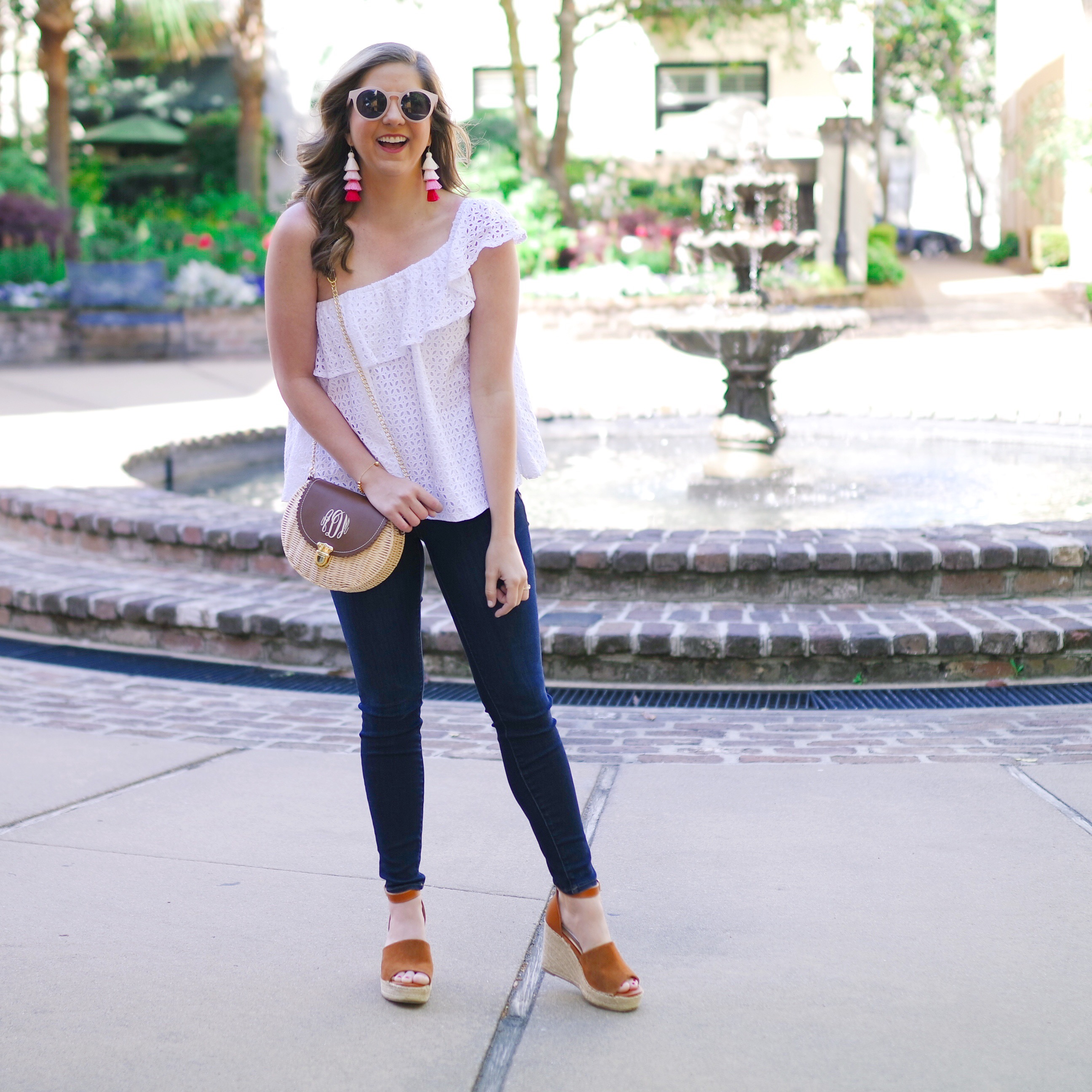 The look is perfect for brunch or summer date night. I went with a monogram wicker bag to complete the Spring look and topped it off with a pair of my favorite espadrille wedges.