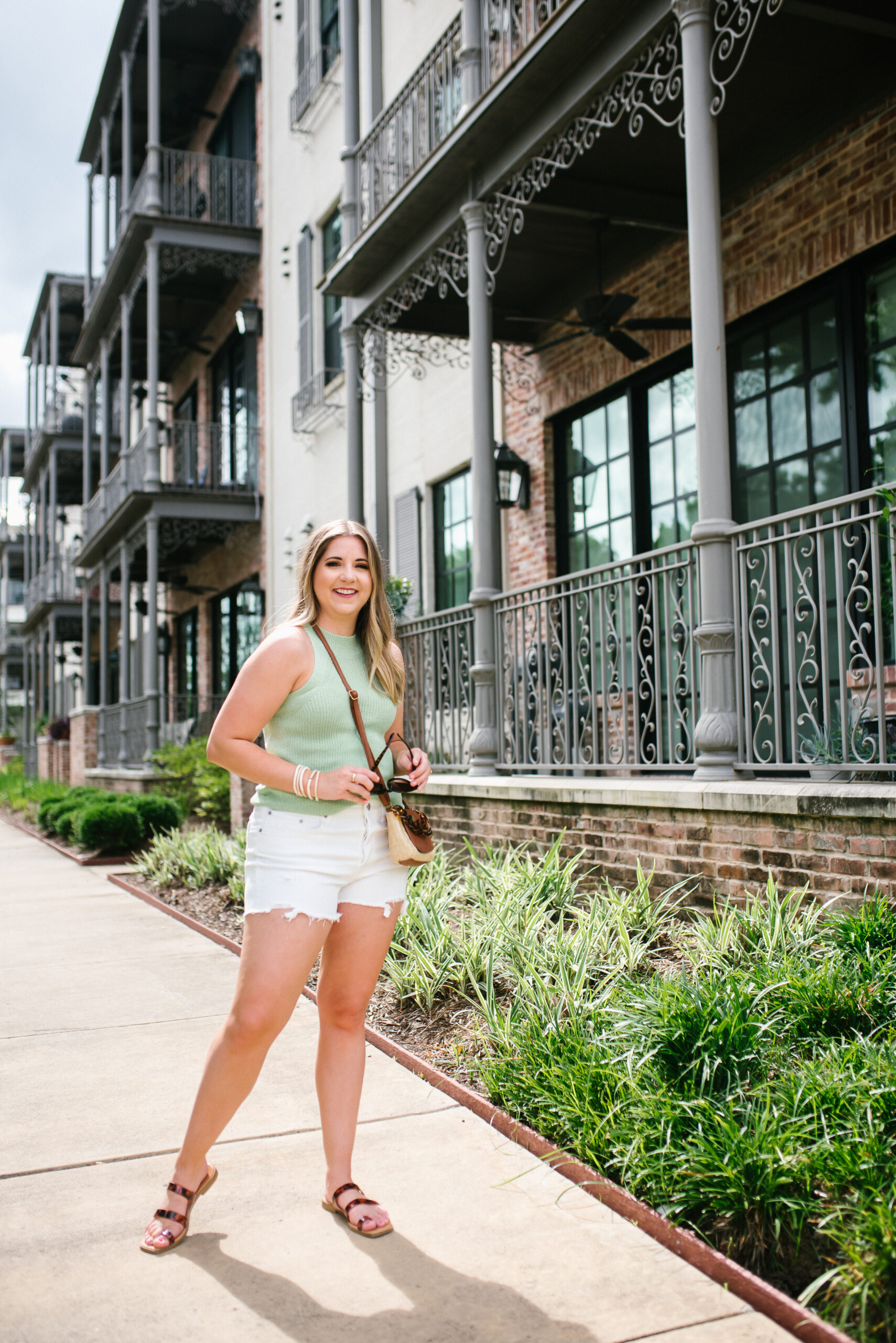 I think this tank is so cute! It can totally be styled in so many ways like with distressed shorts as I show above or even tucked into high-rise jeans and wedges. I am wearing a small and it fits true to size. I am wearing a strapless bra with because it cuts in at the neck, but I think it makes it so flattering. It also comes in 20 other colors!