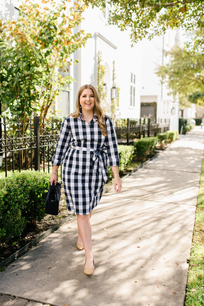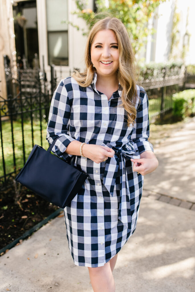 I’m a total sucker for shirt dresses and a total sucker for gingham so this is a match made in heaven. Last year, I snagged a Draper James gingham shirt dress which I loved and wore all season long but it had a full skirt and was midi-length (see more here) whereas this year I wanted something above the knee with a slightly larger gingham pattern.