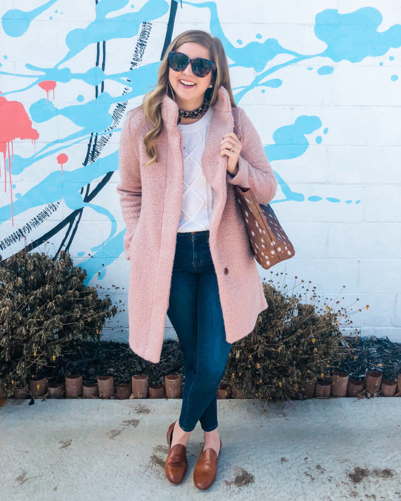Statement coats have been everywhere, whether that’s a subtle pink or a bold cobalt blue. When I’m wearing a bold trend like a statement coat I like to tone down the rest of the outfit to let the coat shine. I love pairing my coats with a basic white sweater. You can never have enough white sweaters!