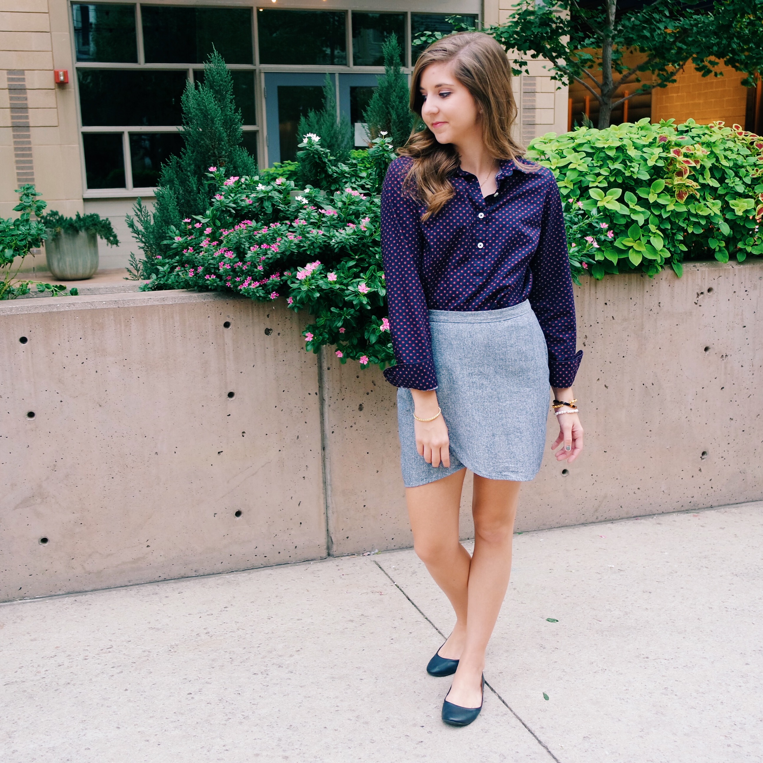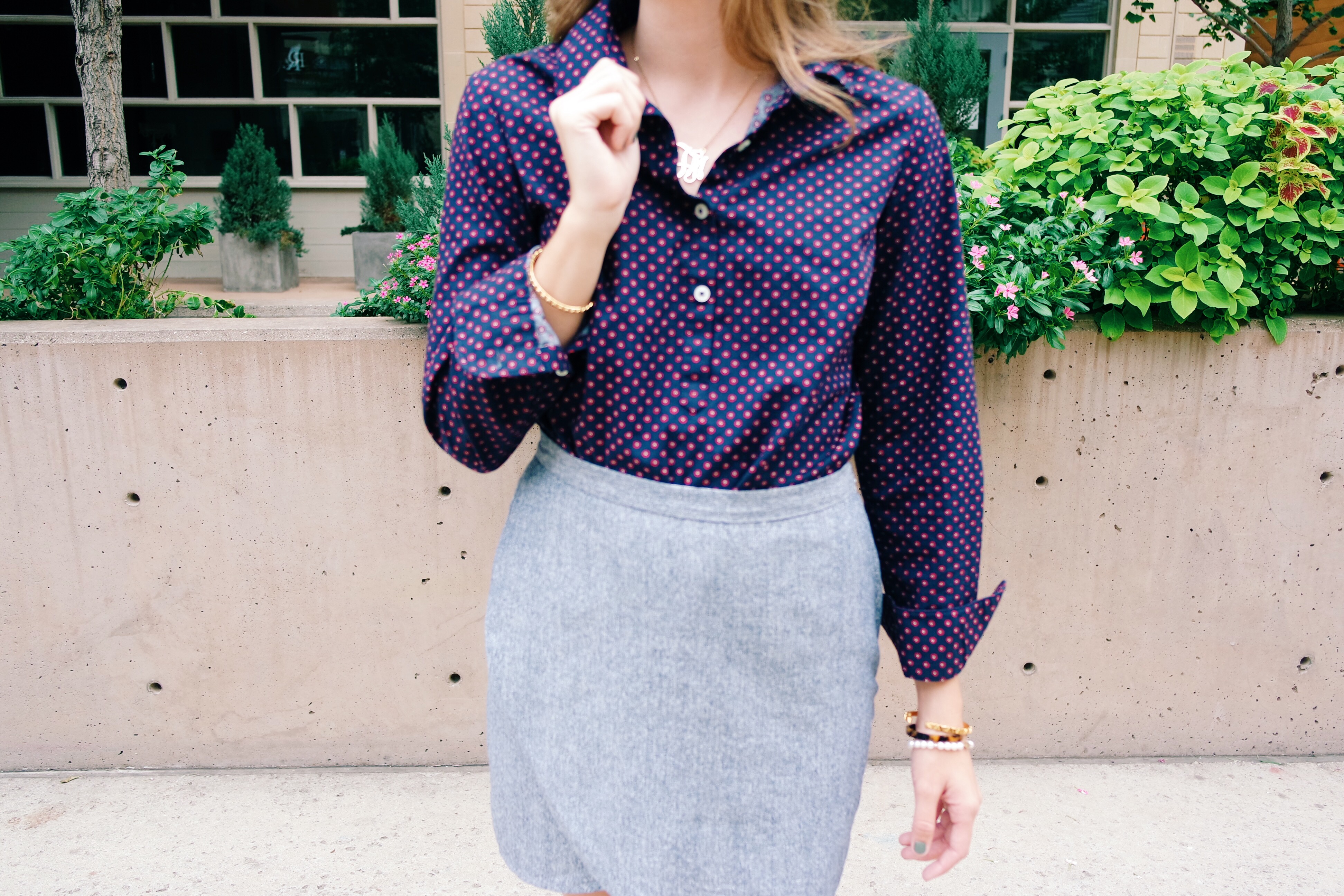 Popover | Skirt | Flats | Monogram Necklace | Bracelet 1 | Bracelet 2 | Bracelet 3 | Bracelet 4
