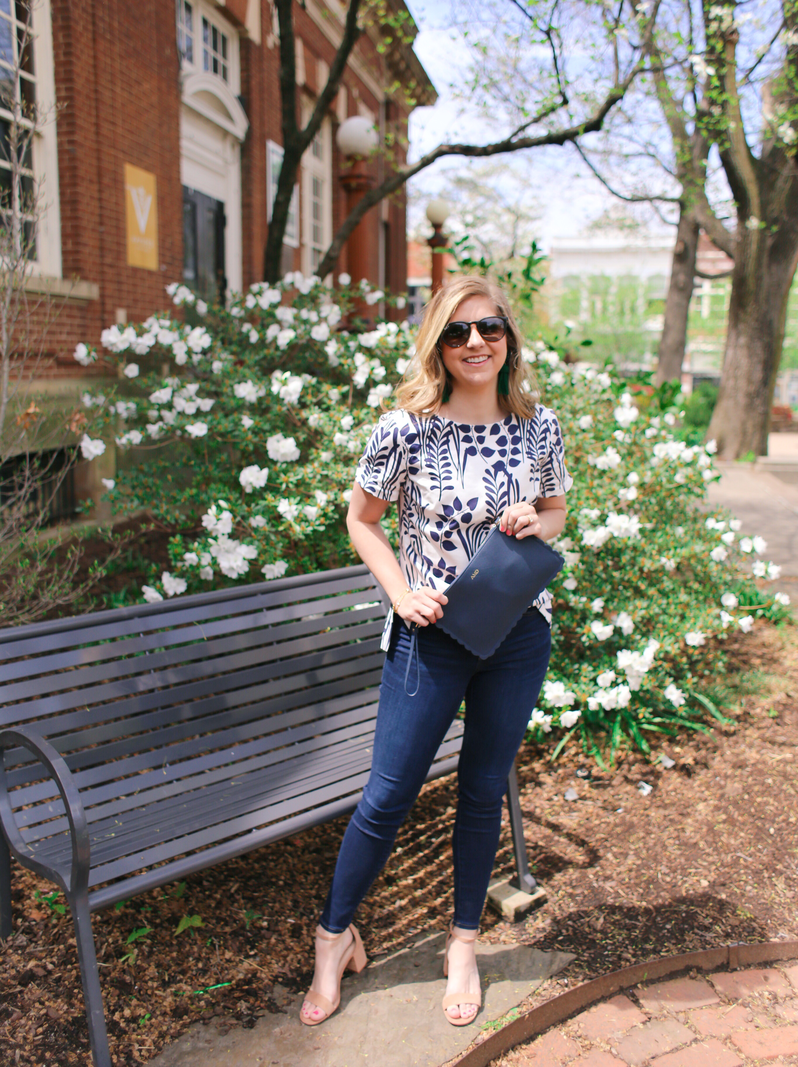The Elizabeth McKay Le Charlot Top might be the most versatile piece in my closet. This classic navy and white floral print is timeless and perfect for dressing up with navy pants for the office or jeans and sandals for date night.
