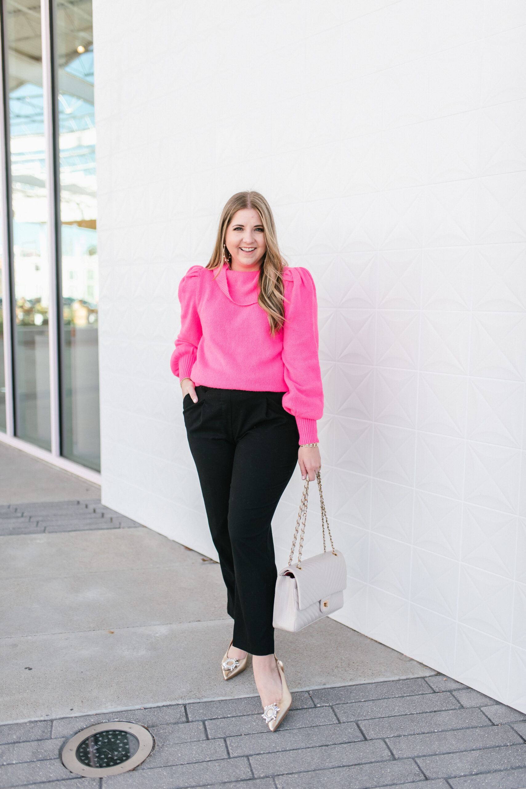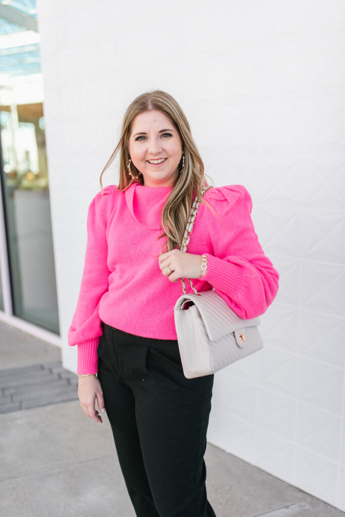 I think good black pants are the base of any good workwear look. To really add a pop and spice up the black pants, I paired a neon pink sweater with them. The black pants keep it professional and classic and really work well together with the sweater. I added a front tuck for shape.