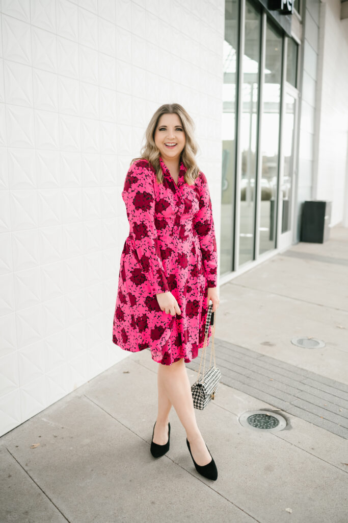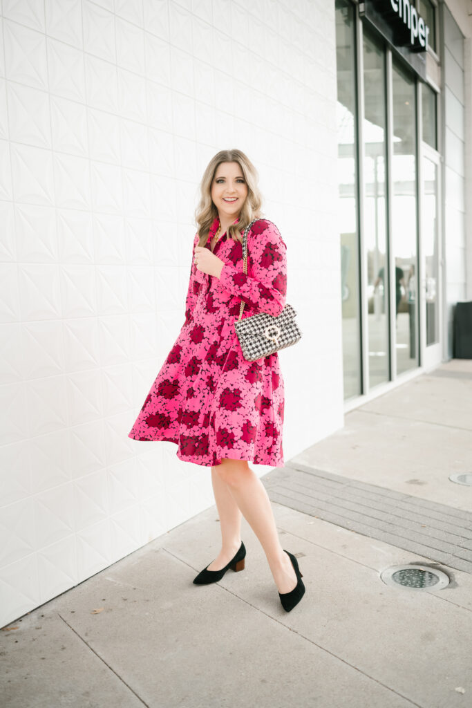 Finally, don’t forget about footwear! For a Galentine’s Day party, opt for a pair of fun and flirty heels. A pair of pink or red heels would be a perfect choice, but you could also opt for a pair of black heels to ground the look and keep it simple. Since the purse and the dress are a lot I wanted to balance it out with a basic black heel.