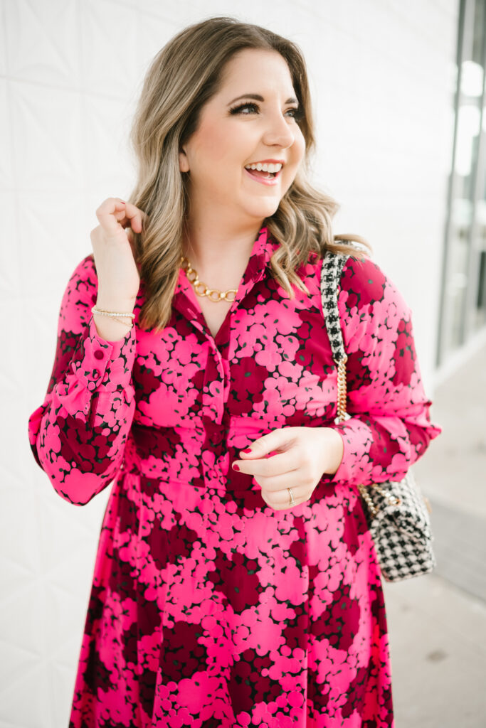 One of the best things about a printed dress is that you don’t need much in the way of accessories. To keep the focus on the dress, opt for simple accessories that complement the colors in the print. For example, a pair of pink or red earrings would be the perfect finishing touch.