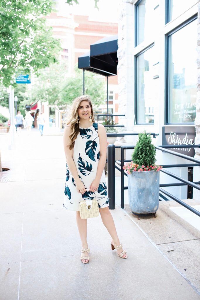 I love this palm leaf shift dress from Ann Taylor because it’s summery and fun while still be professional and breathable. The silhouette is very flattering, not too tight and just the right length. I chose to style it with these adorable bow raffia heels to really play up the summer element, but if you prefer closed toed shoes for work a basic pair of nude pumps would also look adorable.
